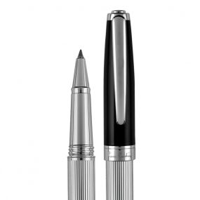 Luxusná súprava rollera a plniaceho pera značky Pierre Cardin v masívnom dizajne v kombinácii striebornej a čiernej farby, s jemným rytím na tele. Hrot je chránený vrchnákom v čiernej farbe. Roller obsahuje značkovú nemeckú náplň Schmidt v modrej farbe s hrotom 0,6 mm a plniace pero 1 ks atramentu v modrej farbe. Roller má priloženú aj náhradnú čiernu náplň. Balené v luxusnej krabičke Pierre Cardin, dodávané s certifkátom pravosti. Rozmery: plniace pero 1 × 13,7 cm; roller 1 × 13,7 cm; balenie 18,5 × 3 ,1 × 7,5 cm.