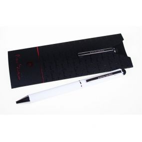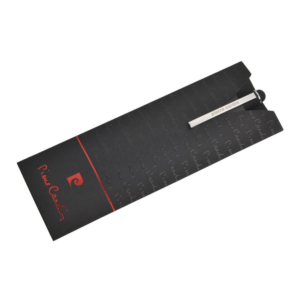 Luxusné guľôčkové pero Pierre Cardin s hliníkovým telom a gumovou povrchovou úpravou, ktorá je veľmi príjemná na dotyk. Pero má strieborné detaily, obsahuje stylus a kvalitnú modrú náplň s hrotom 1 mm. Balené v luxusnom puzdre Pierre Cardin, dodávané s certifkátom pravosti. Rozmery: guľôčkové pero 1 × 14 cm; balenie 5,5 × 15,5 cm.