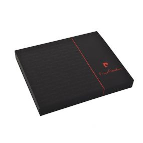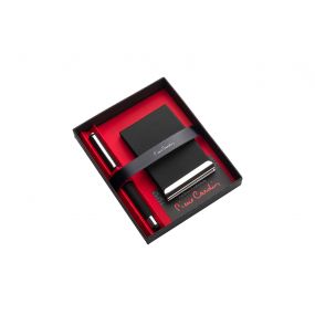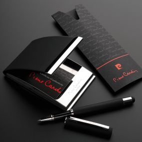 Značková súprava luxusného puzdra na vizitky a čierneho rolleru Pierre Cardin. Puzdro na vizitky je vyrobené z nerezovej ocele s pogumovaným povrchom. Roller má strieborné detaily, nacvakávací vrchnák chrániaci hrot pera a stylus. Obsahuje modrú náplň značky Schneider s hrotom 0,5 mm. Balené v luxusnej krabičke Pierre Cardin, dodávané s certifkátom pravosti. Rozmery: puzdro na vizitky 6,3 × 10 × 1,5 cm; roller 1 × 13,5 cm; balenie 19 × 16 × 2,2 cm.