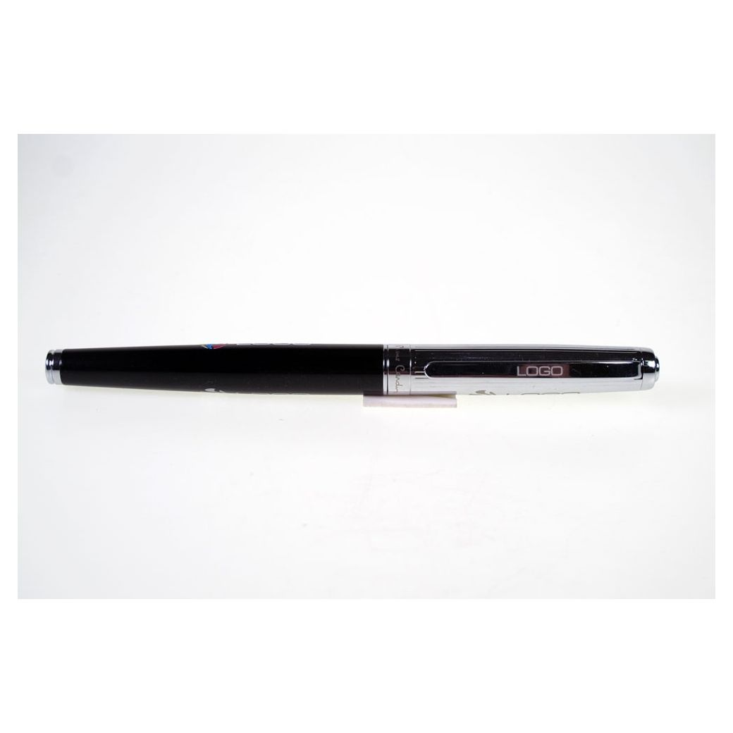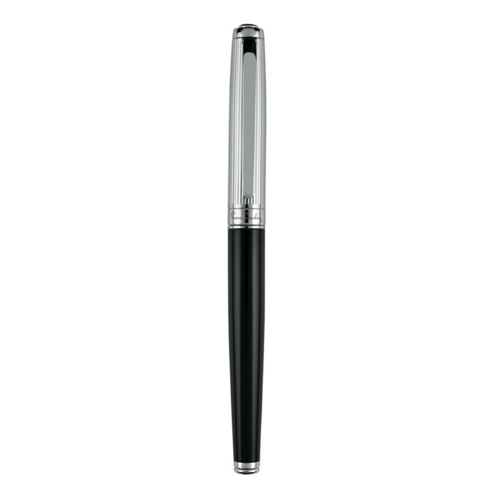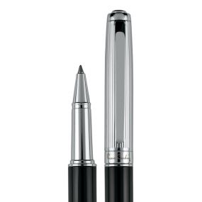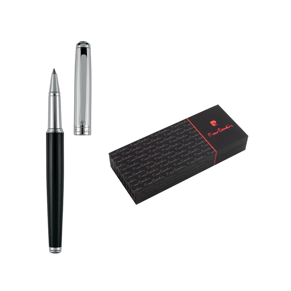 Značkový kovový roller Pierre Cardin. Spodná časť je v čiernom prevedení, vrchná strieborná časť je zdobená jemným rytím na povrchu. Hrot rolleru je chránený strieborným vrchnákom. Roller obsahuje značkovú nemeckú náplň Schmidt v modrej farbe s hrotom 0,6 mm, priložená je aj náhradná náplň v čiernej farbe. Balené v luxusnej krabičke Pierre Cardin, dodávané s certifkátom pravosti. Rozmery: roller 1,1 × 13,8 cm; balenie 18,5 × 3 ,1 × 7,5 cm.