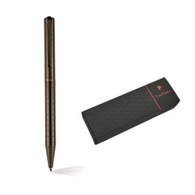 Značkové kovové guľôčkové pero Pierre Cardin s otočným mechanizmom. Telo pera je zdobené šachovnicovým rytím, obsahuje kvalitnú náplň v modrej farbe s hrotom 1 mm a je priložená aj náhradná čierna náplň. Balené v luxusnej krabičke Pierre Cardin, dodávané s certifkátom pravosti. Rozmery: guľôčkové pero 1 × 13,7 cm; balenie 17,5 × 5,5 × 3,5 cm.