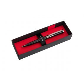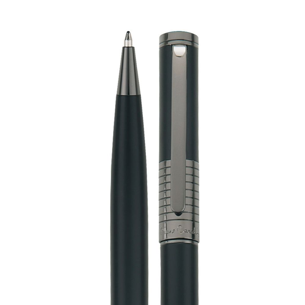Luxusné kovové guľôčkové pero Pierre Cardin má pútavý dizajn elegantne hladkého povrchu, na ktorom vyniká nápaditá rytina v gunmetalovej farbe umiestnená v hornej časti tela. Guľôčkové pero má kvalitnú náplň v modrej farbe s hrotom 1 mm a obsahuje aj náhradnú čiernu náplň. Je balené v luxusnej papierovej krabičke Pierre Cardin, dodávané s certifkátom pravosti. Rozmery: guľôčkové pero 1,2 × 13,8 cm; balenie 17,5 × 5,5 × 3,5 cm.