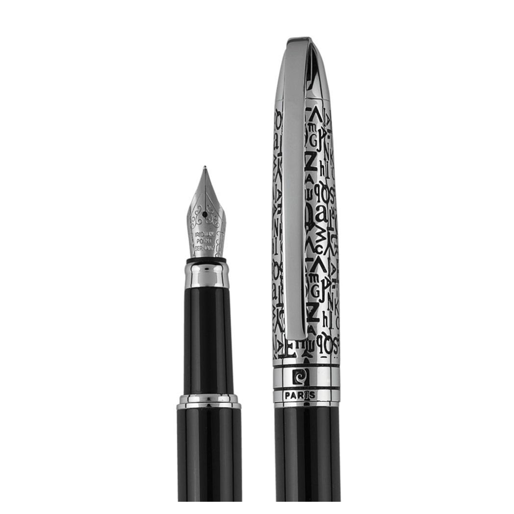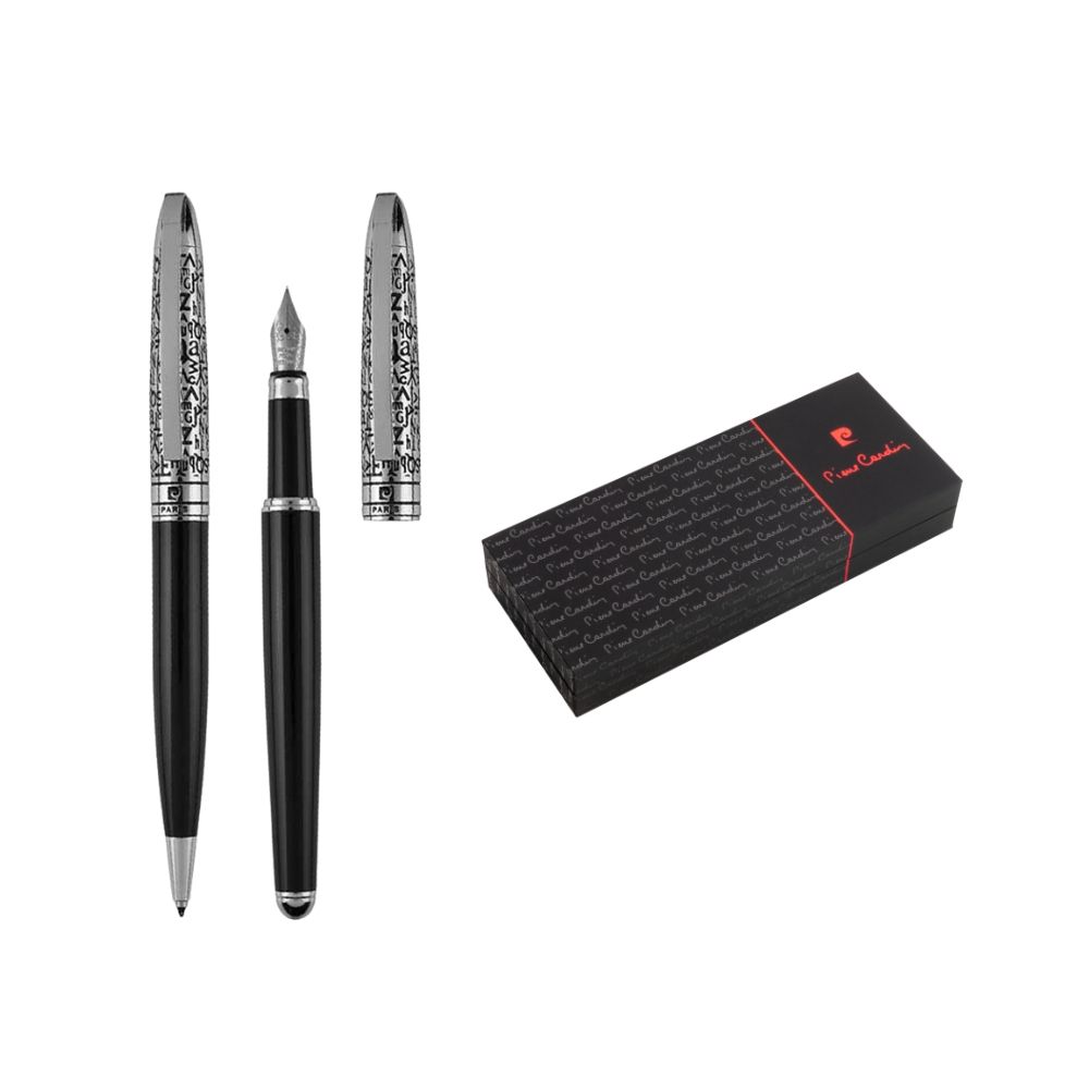 Značkové kovové plniace pero Pierre Cardin. Výrazná kombinácia čierneho tela a strieborného vrchnáku s osobitým tmavým rytím latinky do povrchu. Plniace pero obsahuje 1 ks atramentu v modrej farbe. Balené v luxusnej krabičke Pierre Cardin, dodávané s certifkátom pravosti. Rozmery: plniace pero 1 × 14 cm; balenie 18,5 × 3,1 × 7,5 cm.