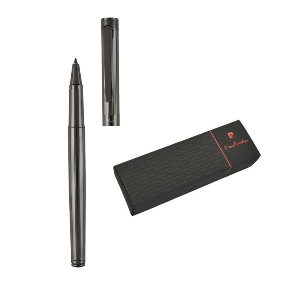Značkový roller Pierre Cardin. Kovové telo rolleru má jemné rytie po celej dĺžke povrchu, hrot rolleru je chránený vrchnákom. Roller obsahuje značkovú nemeckú náplň Schmidt v modrej farbe s hrotom 0,6 mm a má priloženú náhradnú čiernu náplň. Balený v luxusnej krabičke Pierre Cardin, dodávaný s certifkátom pravosti. Rozmery: roller 1,2 × 14 cm; balenie 17,5 × 5,5 × 3,5 cm.
