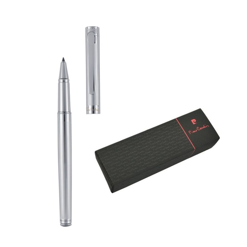 Značkový roller Pierre Cardin. Kovové telo rolleru má jemné rytie po celej dĺžke povrchu, hrot rolleru je chránený vrchnákom. Roller obsahuje značkovú nemeckú náplň Schmidt v modrej farbe s hrotom 0,6 mm a má priloženú náhradnú čiernu náplň. Balený v luxusnej krabičke Pierre Cardin, dodávaný s certifkátom pravosti. Rozmery: roller 1,2 × 14 cm; balenie 17,5 × 5,5 × 3,5 cm.